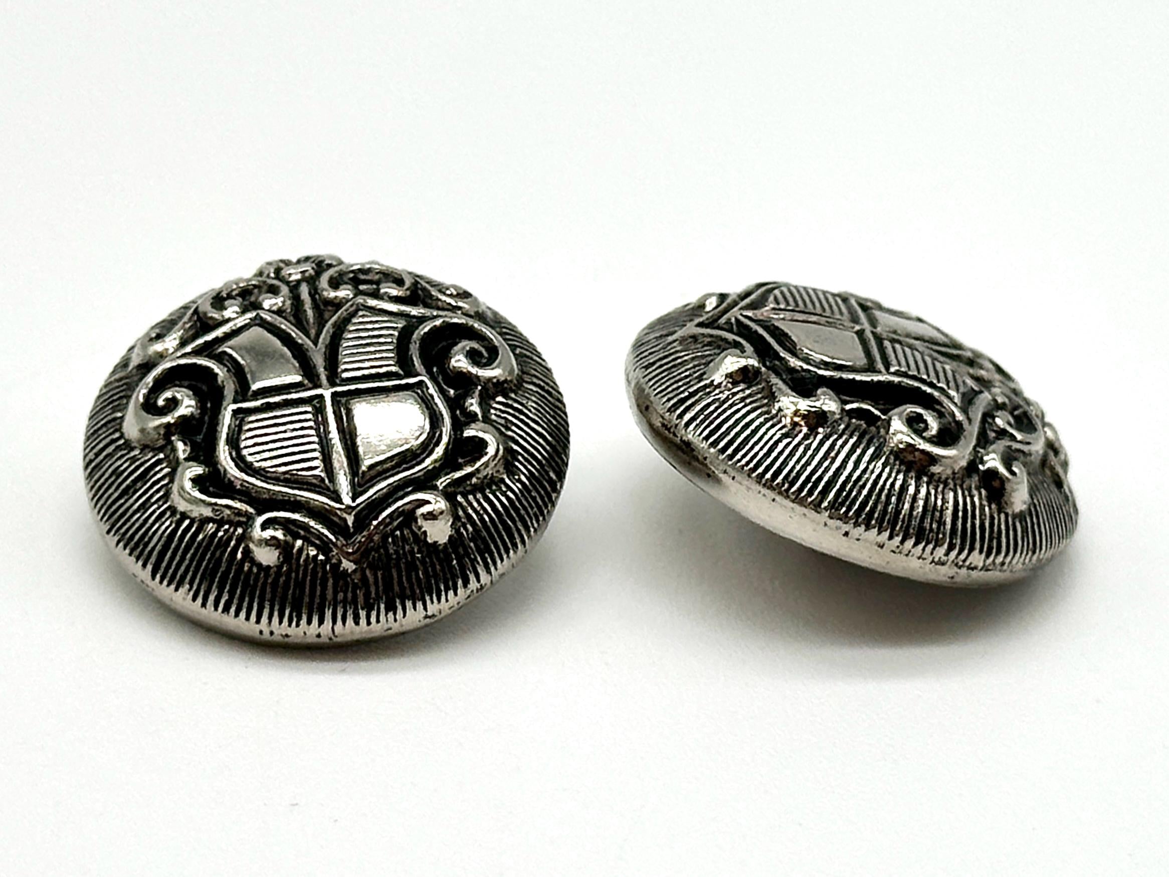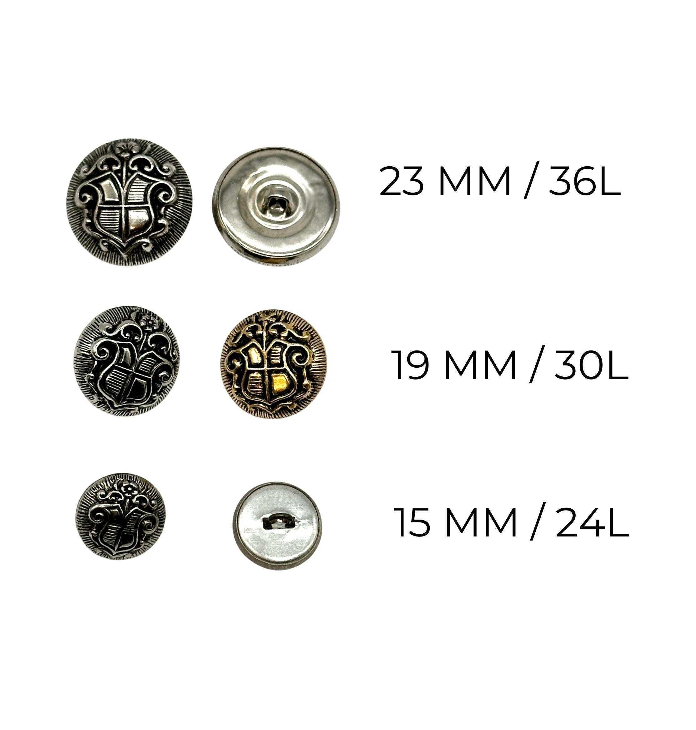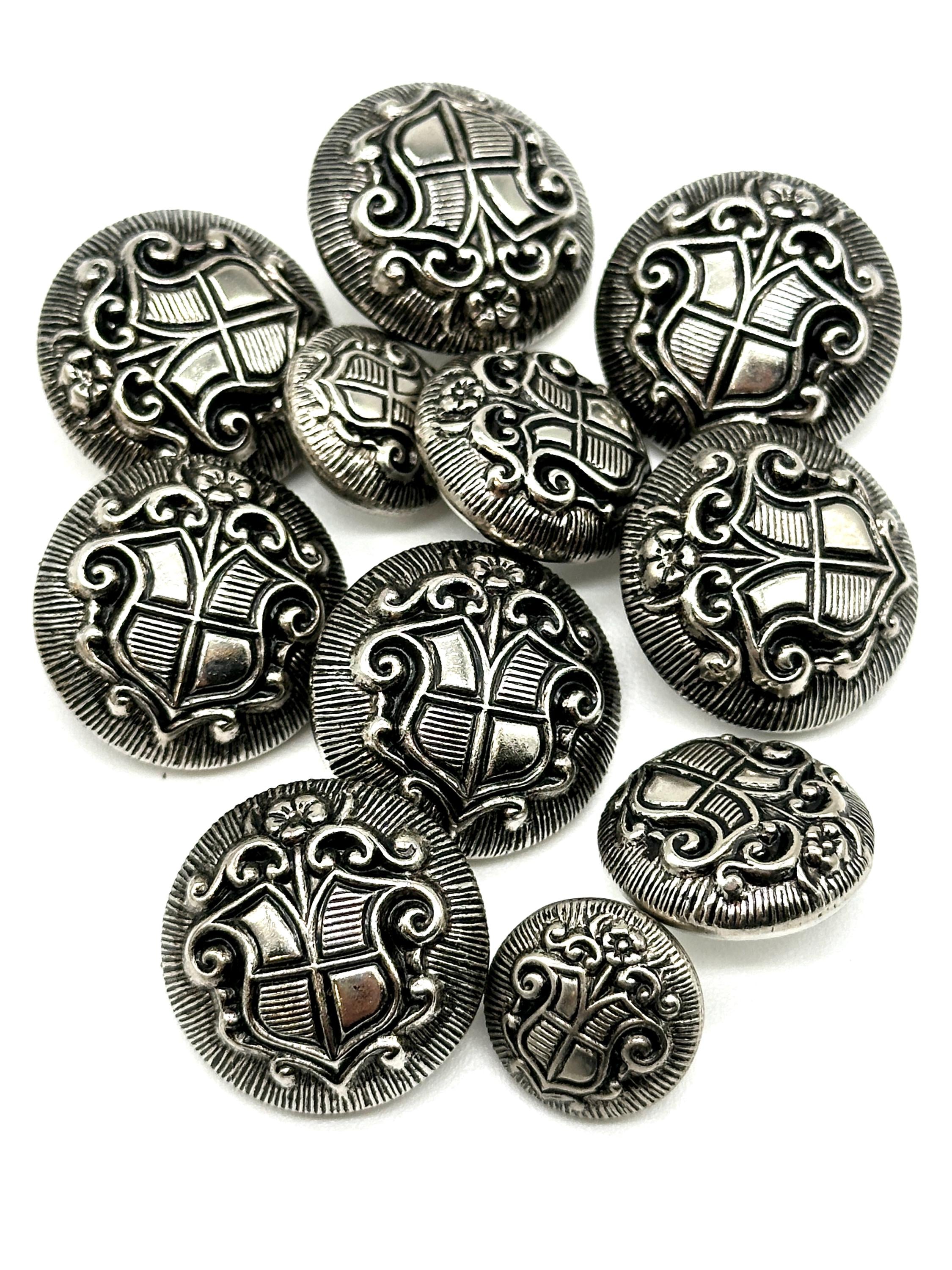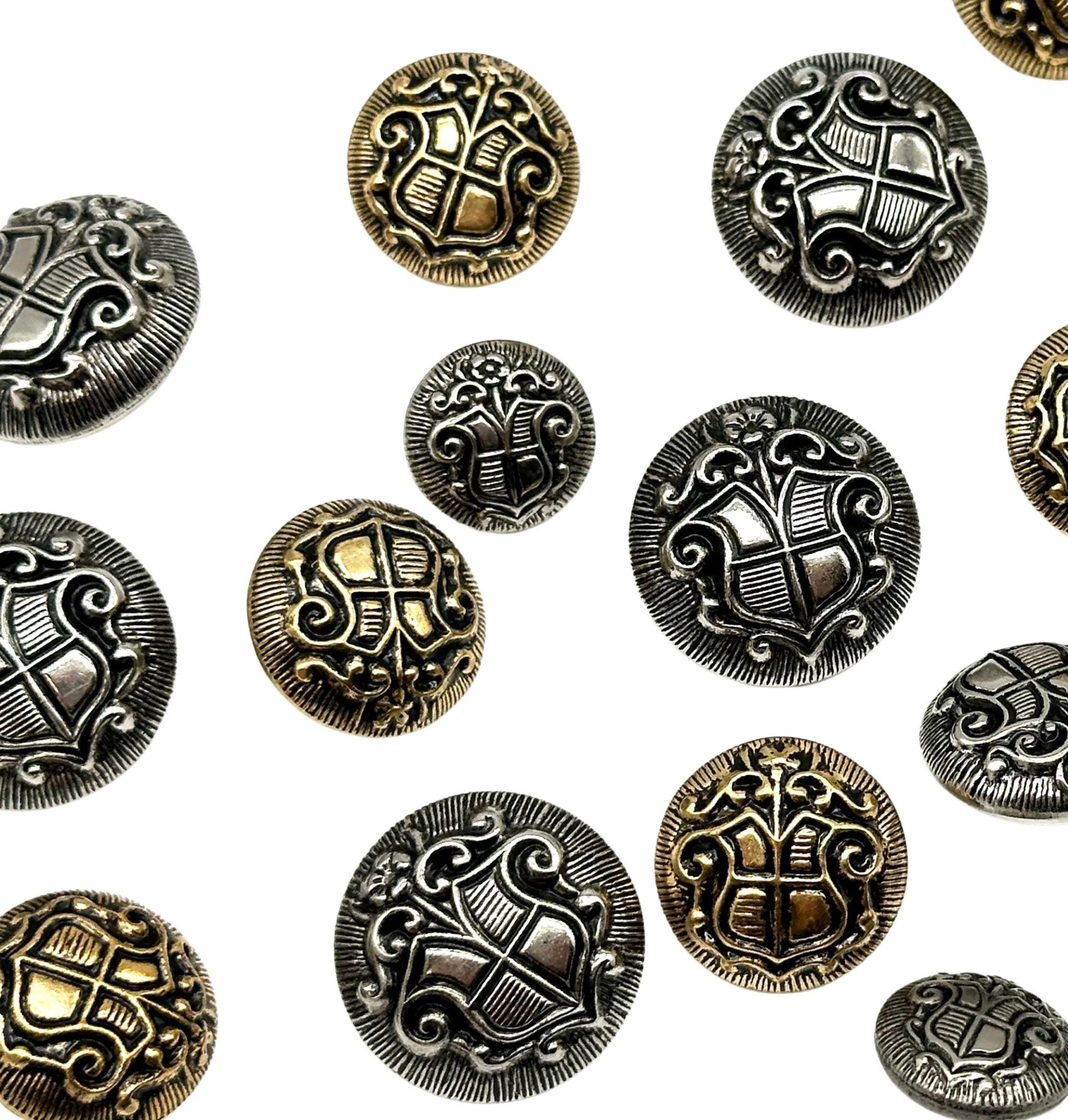 Colors Available: Antique Gold and Silver Sizes Available: Multiple sizes Condition: Unused, sourced from our extensive collection of vintage buttons Quantity: Set of 12 buttonsThese buttons are ideal for adding a regal, vintage touch to coats, blazers, and suits, or for creating unique upcycled fashion projects. Whether you're embellishing a jacket or working on DIY crafts, these buttons are perfect for any sewing or button project.Style Code: 6128