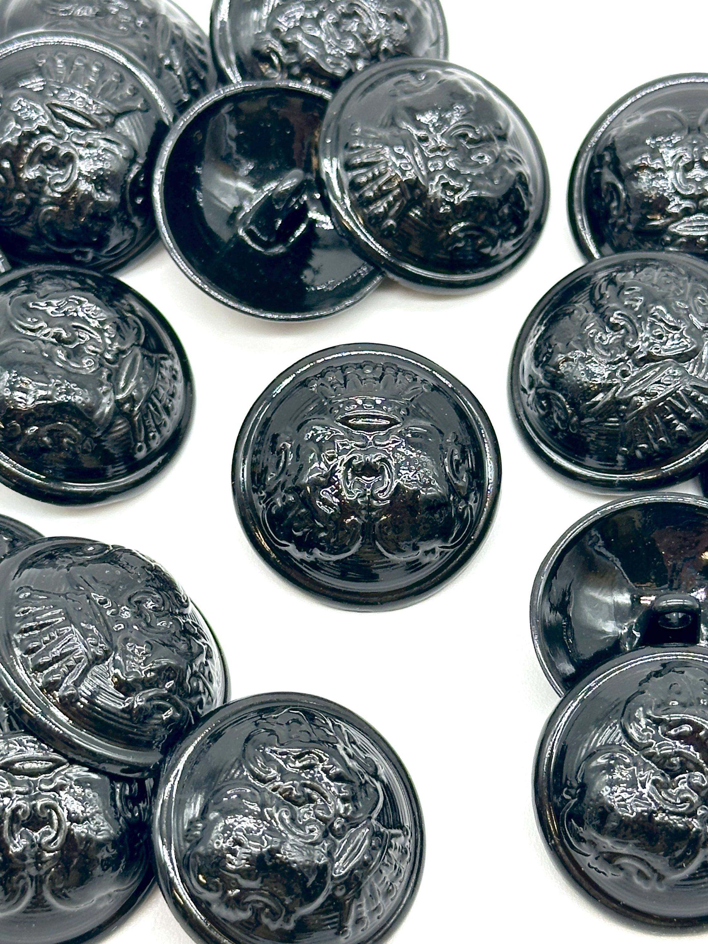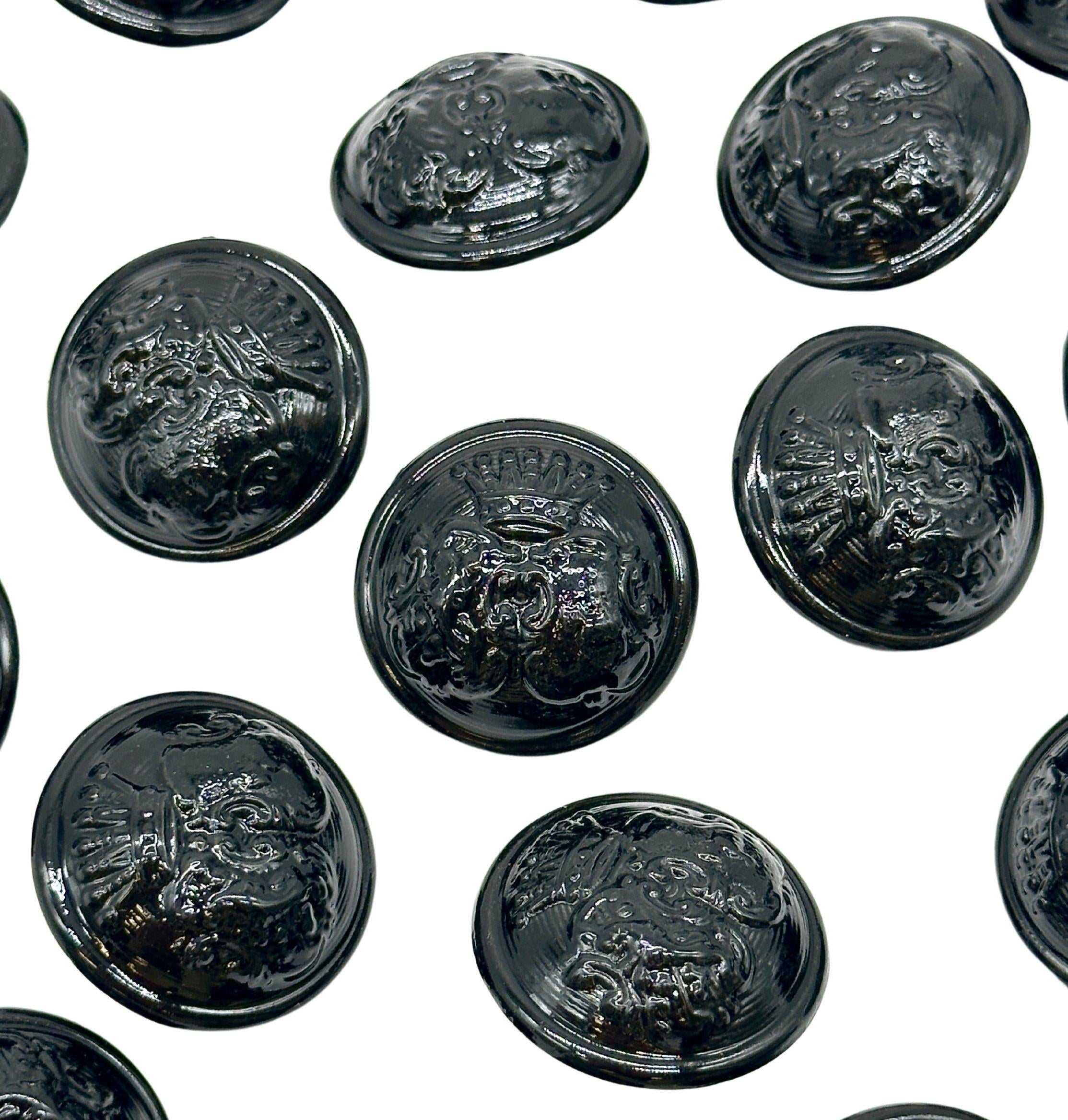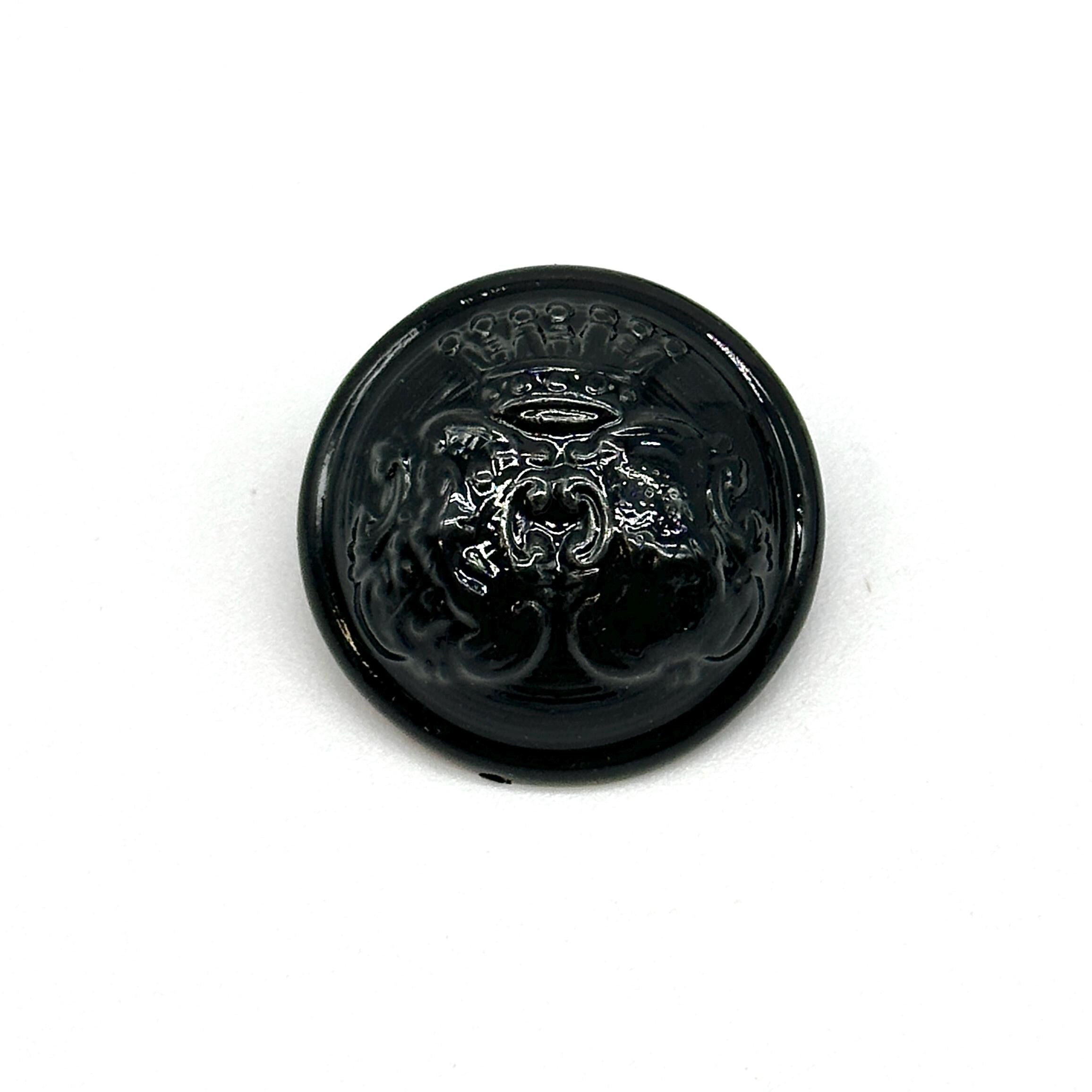 Set of 12 Vintage Black Coat of Arms Shank Buttons - Perfect for Jackets, Coats, and Crafting ProjectsElevate your sewing and DIY creations with these stunning vintage black coat of arms shank buttons. Each button features a detailed coat of arms emblem with a glossy black finish, making them ideal for adding a regal touch to your garments. These buttons are perfect for jackets, coats, blazers, and more, offering a unique decorative flair to your designs.Crafted from durable materials, these antique-inspired buttons are ideal for use in fashion, crafting, and upcycling projects. The elegant design and solid construction make them perfect for both professional and personal use. Whether you're replacing old buttons or adding a vintage touch to a new piece, these buttons will make your garments stand out.Product Features:Material: High-quality metal with a glossy black finish