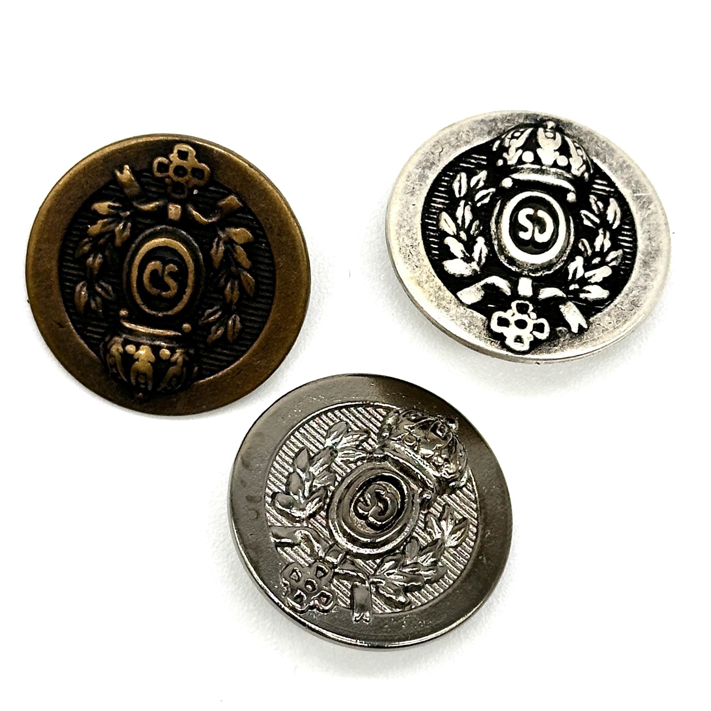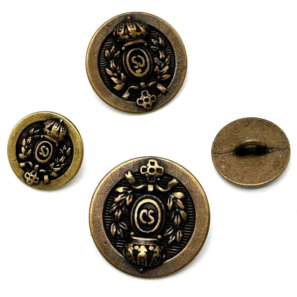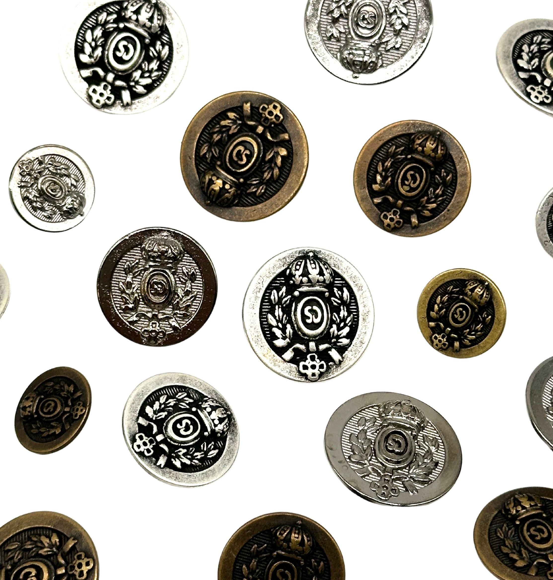 Set of 12 Vintage Coat of Arms Metal Shank Buttons - Perfect for Sewing, DIY Crafts, and Decorative ProjectsElevate your garments and crafting projects with these exquisite vintage coat of arms metal shank buttons. Each button showcases a timeless design featuring a cross, crown, and branches, adding a regal touch to jackets, coats, blazers, dresses, and more. These authentic vintage buttons, crafted in Italy during the 1980s, are sourced from our extensive collection and remain unused, preserving their impeccable condition.Ideal for both sewing and upcycling projects, these high-quality metal buttons are available in three elegant colorways and several sizes, making them versatile for various applications. Whether you’re creating a custom blazer, refurbishing a jacket, or designing a unique DIY craft, these buttons add a sophisticated, vintage-inspired accent.Details:Material: Solid metal shank