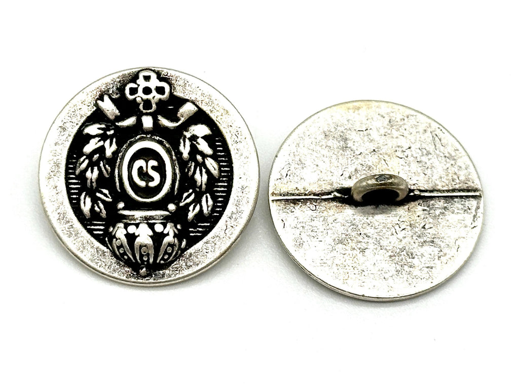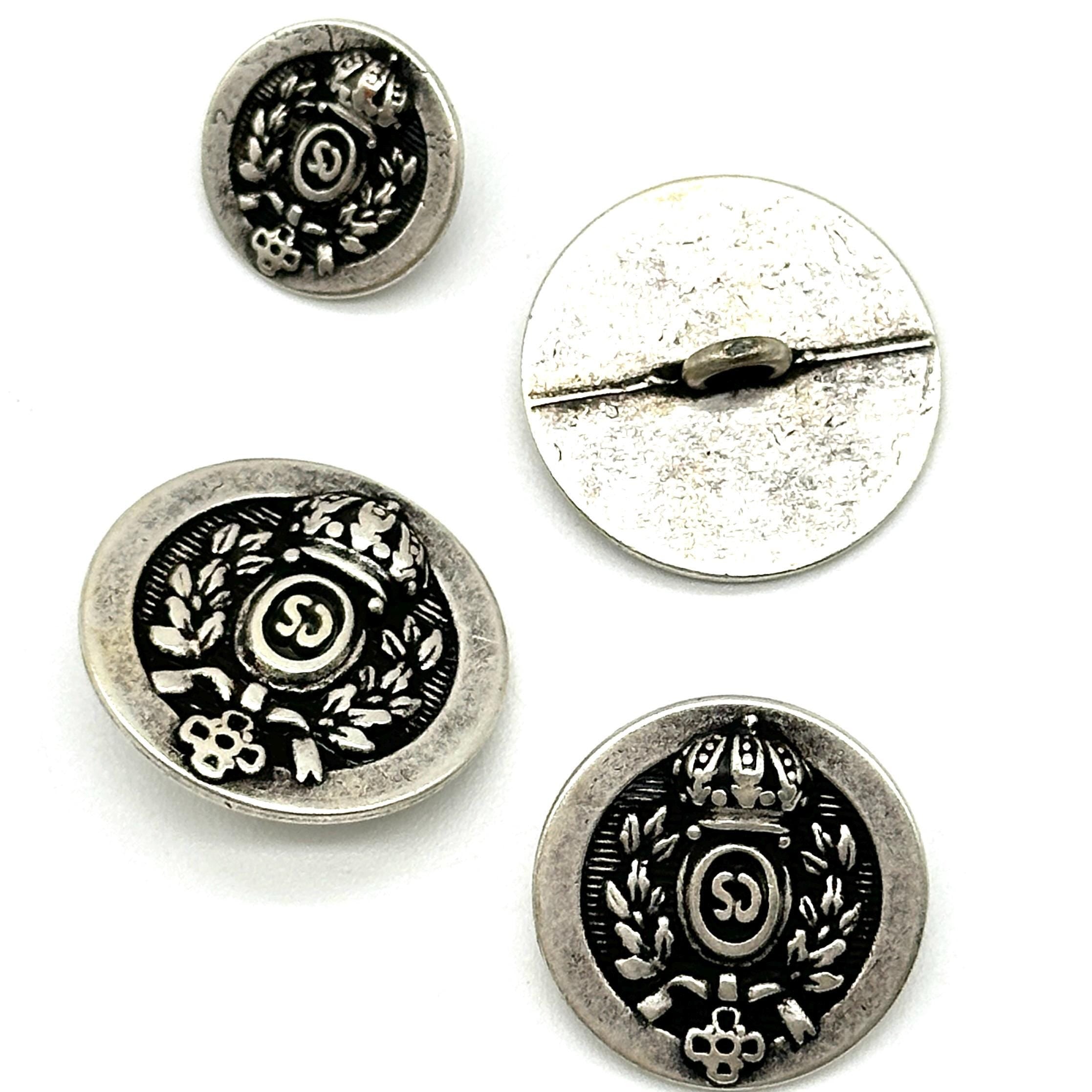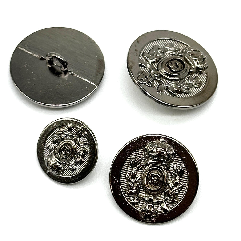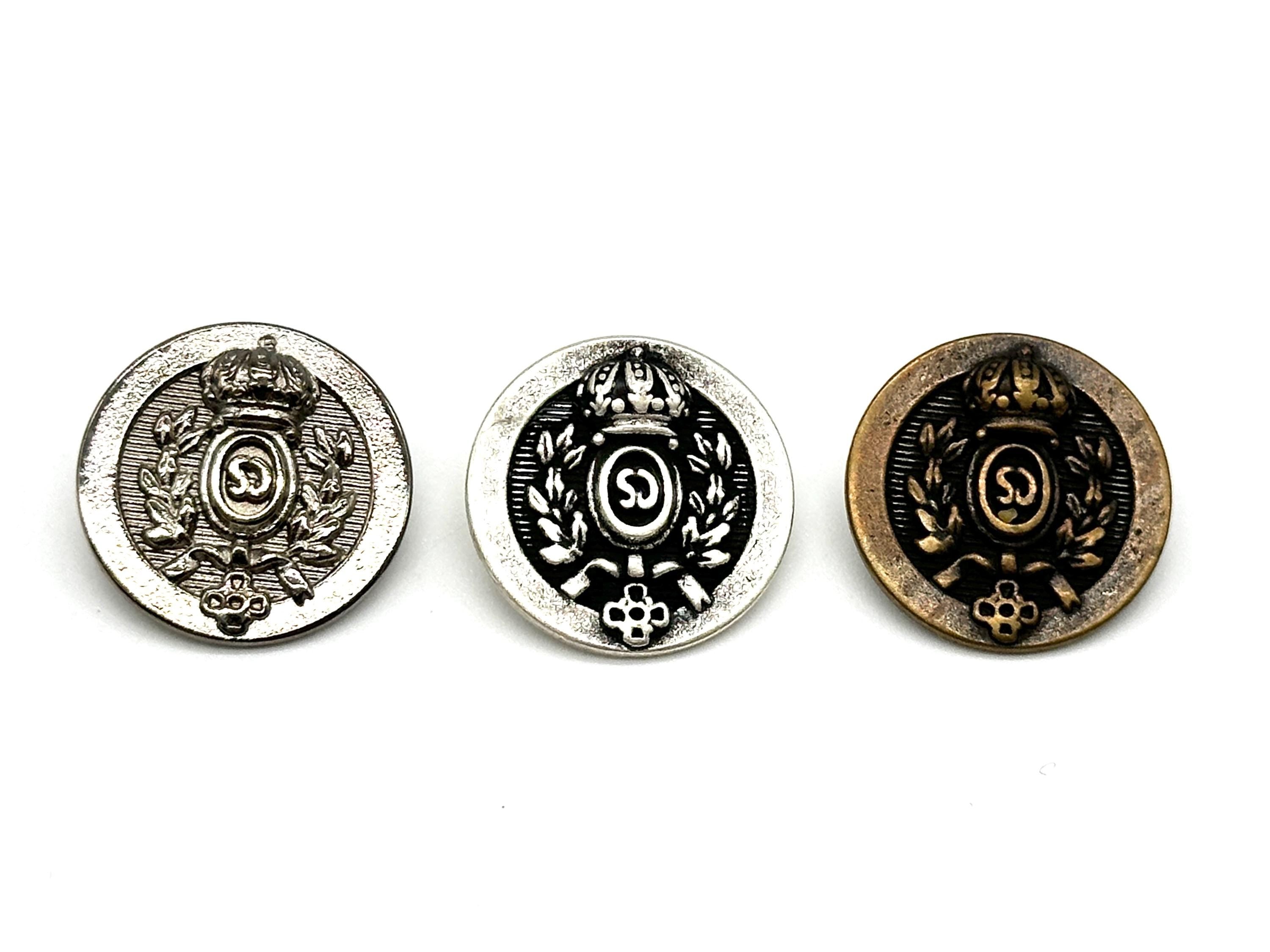 Set of 12 Vintage Coat of Arms Metal Shank Buttons - Perfect for Sewing, DIY Crafts, and Decorative ProjectsElevate your garments and crafting projects with these exquisite vintage coat of arms metal shank buttons. Each button showcases a timeless design featuring a cross, crown, and branches, adding a regal touch to jackets, coats, blazers, dresses, and more. These authentic vintage buttons, crafted in Italy during the 1980s, are sourced from our extensive collection and remain unused, preserving their impeccable condition.Ideal for both sewing and upcycling projects, these high-quality metal buttons are available in three elegant colorways and several sizes, making them versatile for various applications. Whether you’re creating a custom blazer, refurbishing a jacket, or designing a unique DIY craft, these buttons add a sophisticated, vintage-inspired accent.Details:Material: Solid metal shank