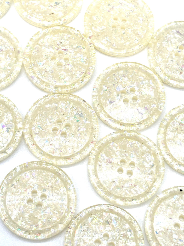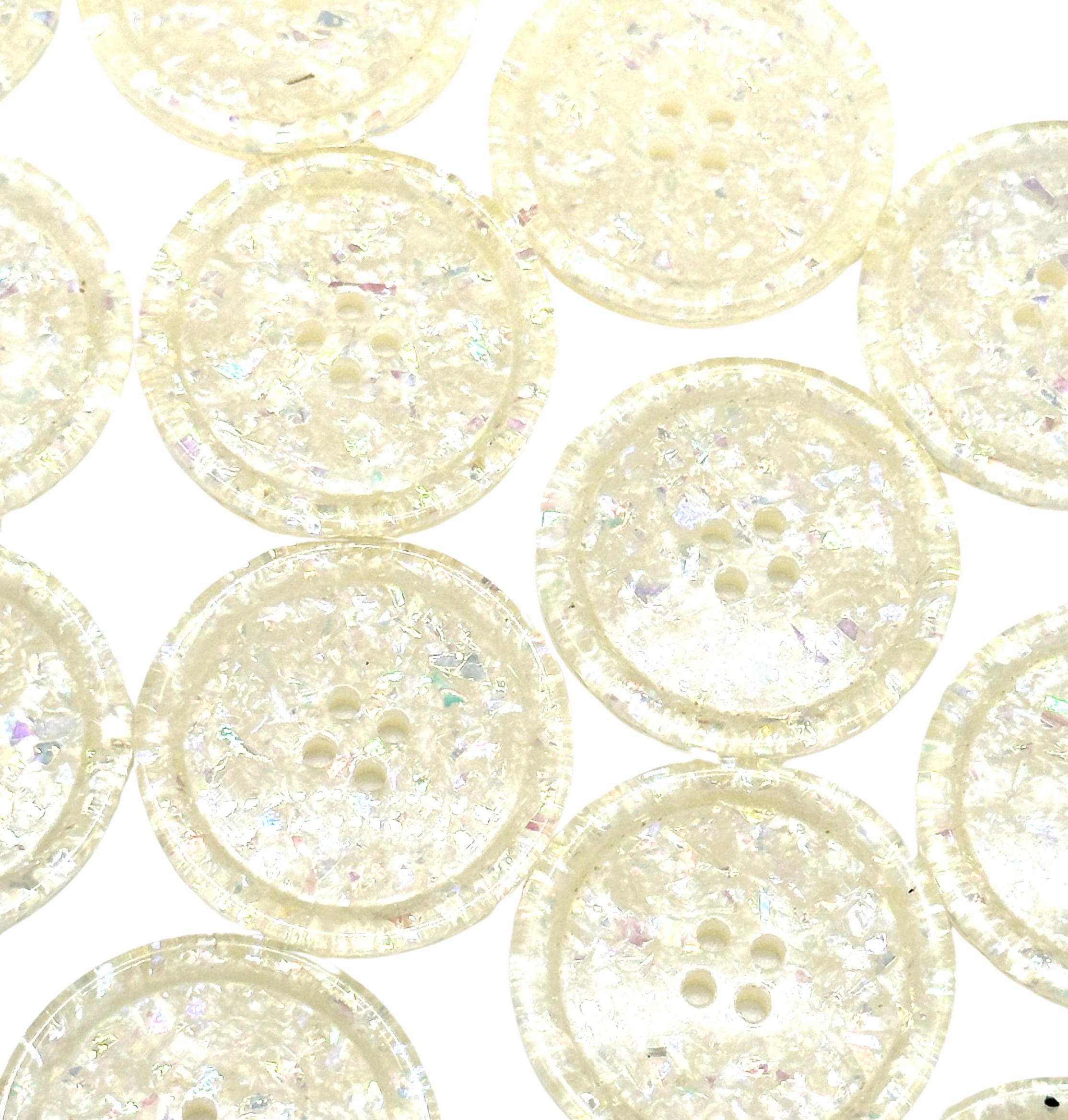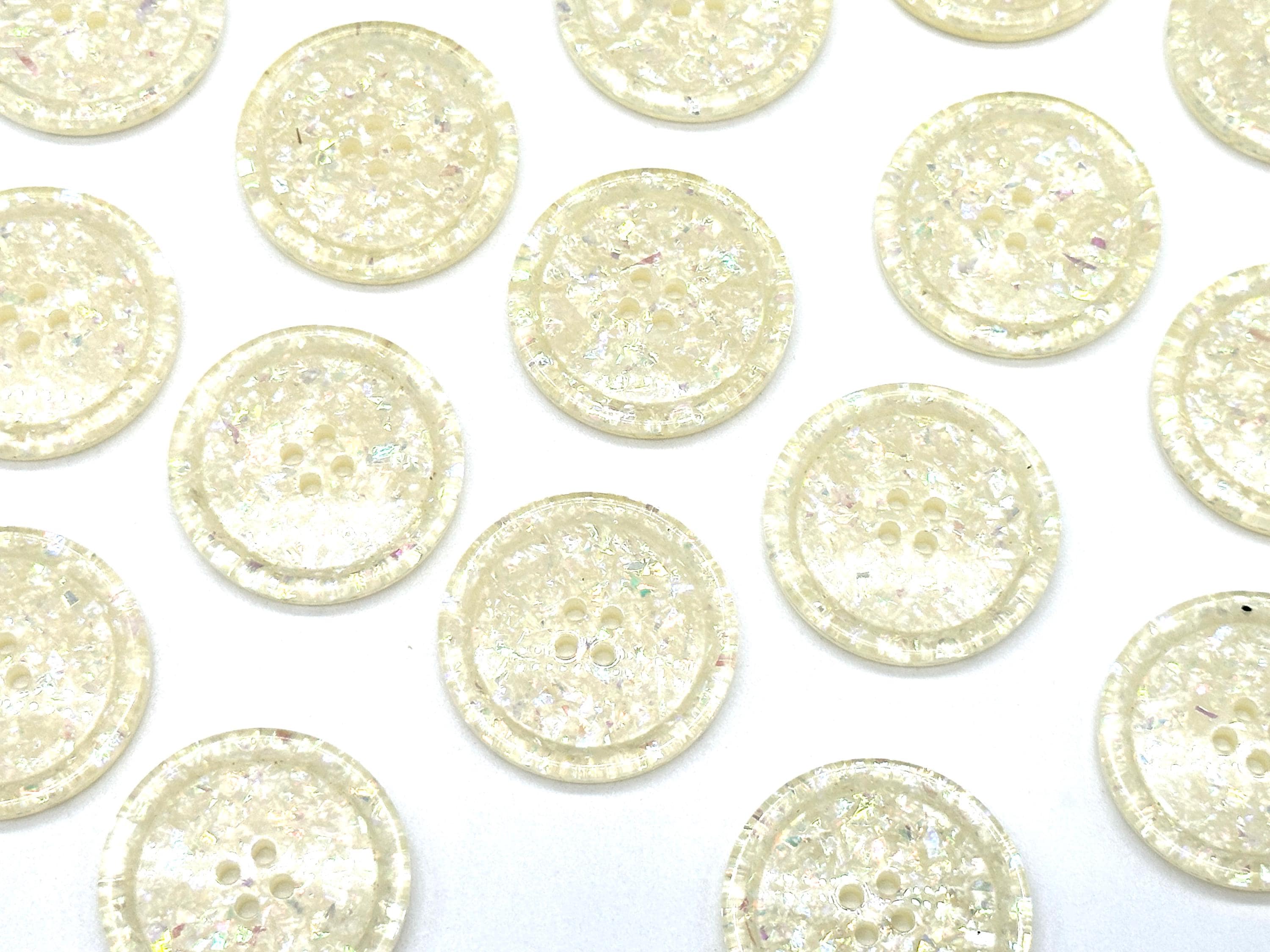 Set of 12 Vintage Iridescent White Glitter 4-Hole Buttons - Perfect for Sewing, Crafting, and DIY Decorative ProjectsEnhance your sewing and craft projects with these vintage iridescent white glitter buttons. Each button features a dazzling, pearlescent shimmer with a subtle glitter effect, making them ideal for adding a unique, decorative touch to clothing and accessories. These buttons are 30MM in size and have a classic four-hole design, making them perfect for jackets, coats, sweaters, shirts, and dresses.Crafted from high-quality plastic with a glossy finish, these buttons are lightweight, durable, and suitable for various fashion and upcycling projects. They’re sold in a convenient pack of 12, ideal for small and large projects alike.Details:Material: High-quality plastic with iridescent glitter finish