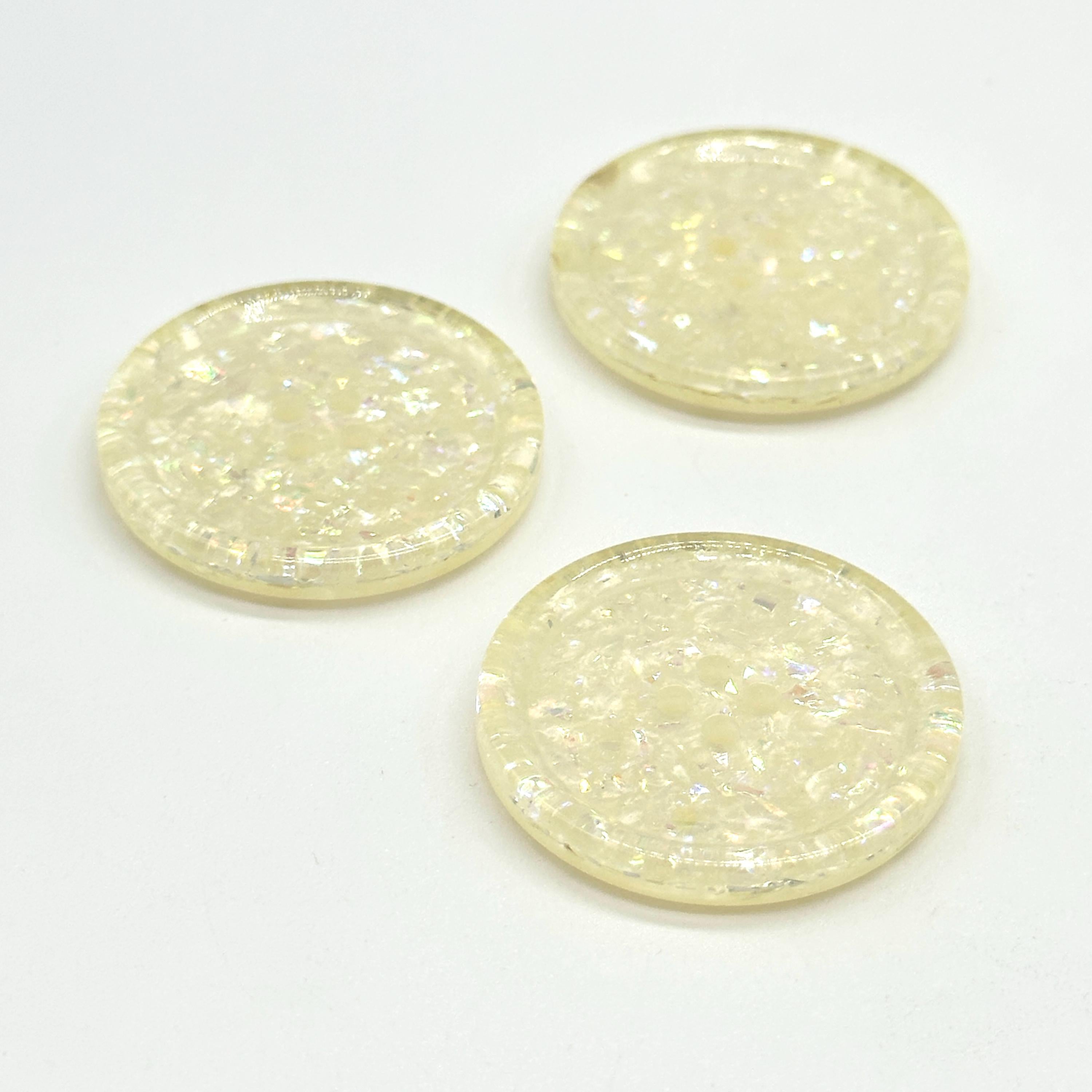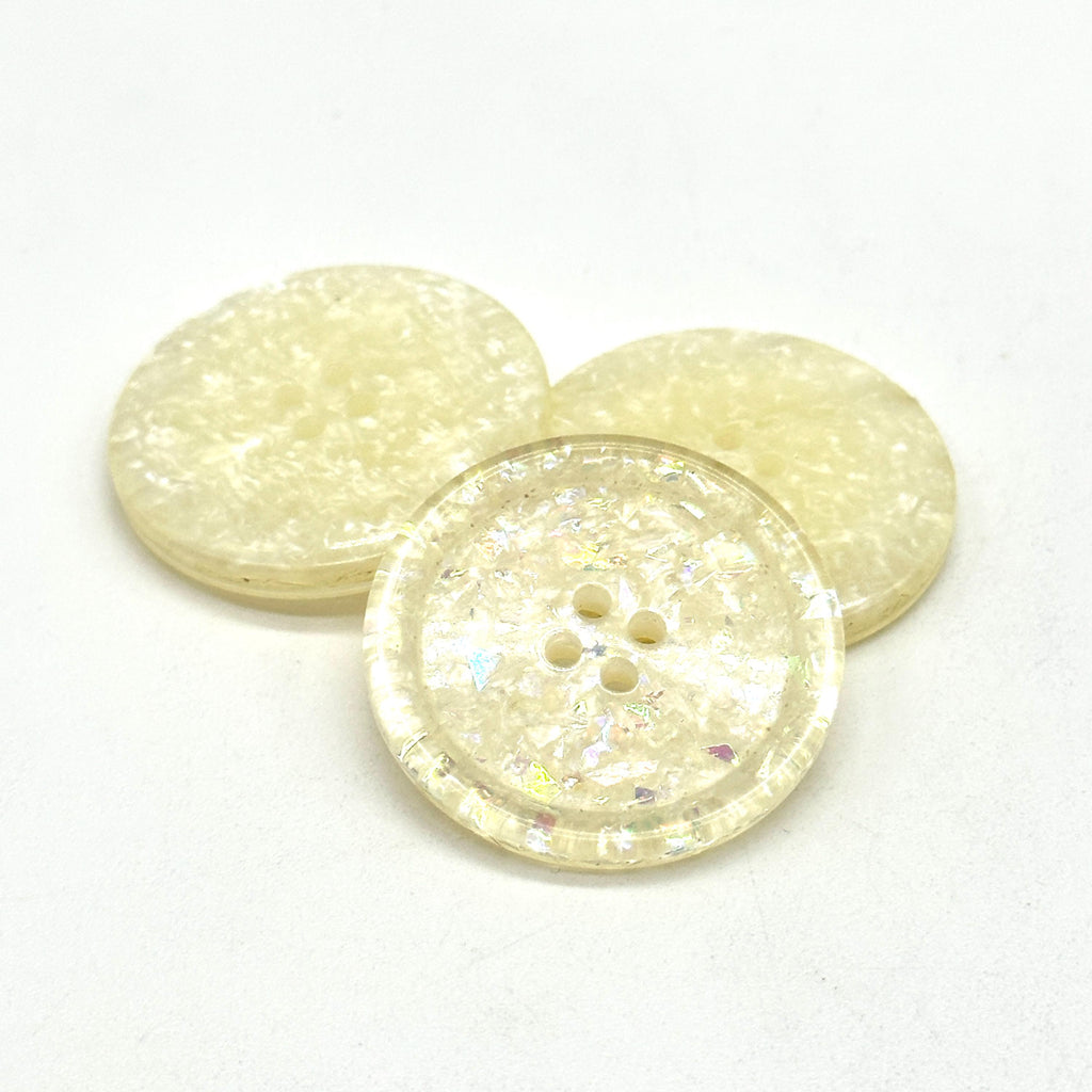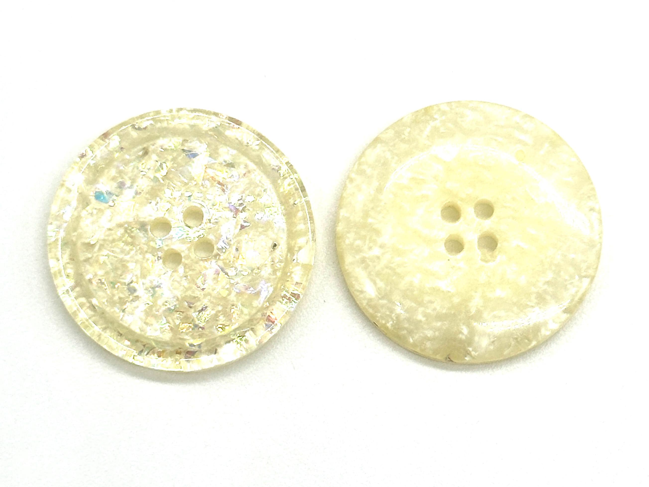 Set of 12 Vintage Iridescent White Glitter 4-Hole Buttons - Perfect for Sewing, Crafting, and DIY Decorative ProjectsEnhance your sewing and craft projects with these vintage iridescent white glitter buttons. Each button features a dazzling, pearlescent shimmer with a subtle glitter effect, making them ideal for adding a unique, decorative touch to clothing and accessories. These buttons are 30MM in size and have a classic four-hole design, making them perfect for jackets, coats, sweaters, shirts, and dresses.Crafted from high-quality plastic with a glossy finish, these buttons are lightweight, durable, and suitable for various fashion and upcycling projects. They’re sold in a convenient pack of 12, ideal for small and large projects alike.Details:Material: High-quality plastic with iridescent glitter finish
